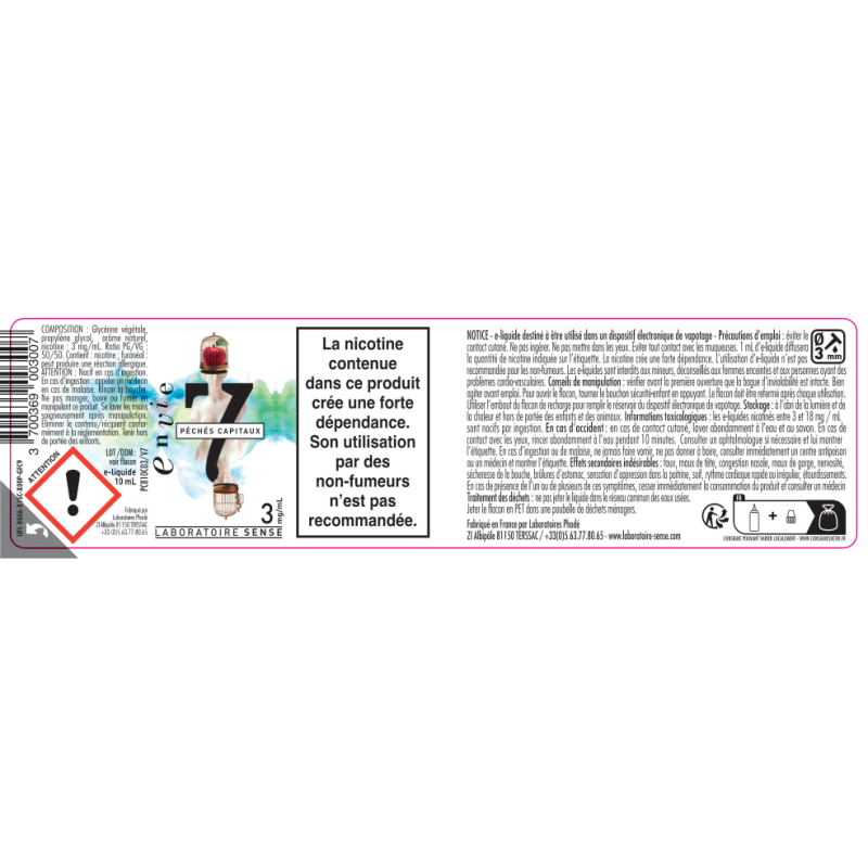 Conformément à la législation européenne, chaque flacon présente un étiquetage avec la dénomination commerciale, la marque, le parfum, la composition du e-liquide, le taux de nicotine, le nom, l’adresse de la société, la date limite d'utilisation optimale et le numéro de lot.