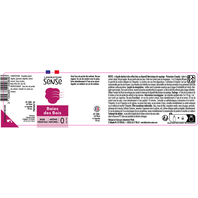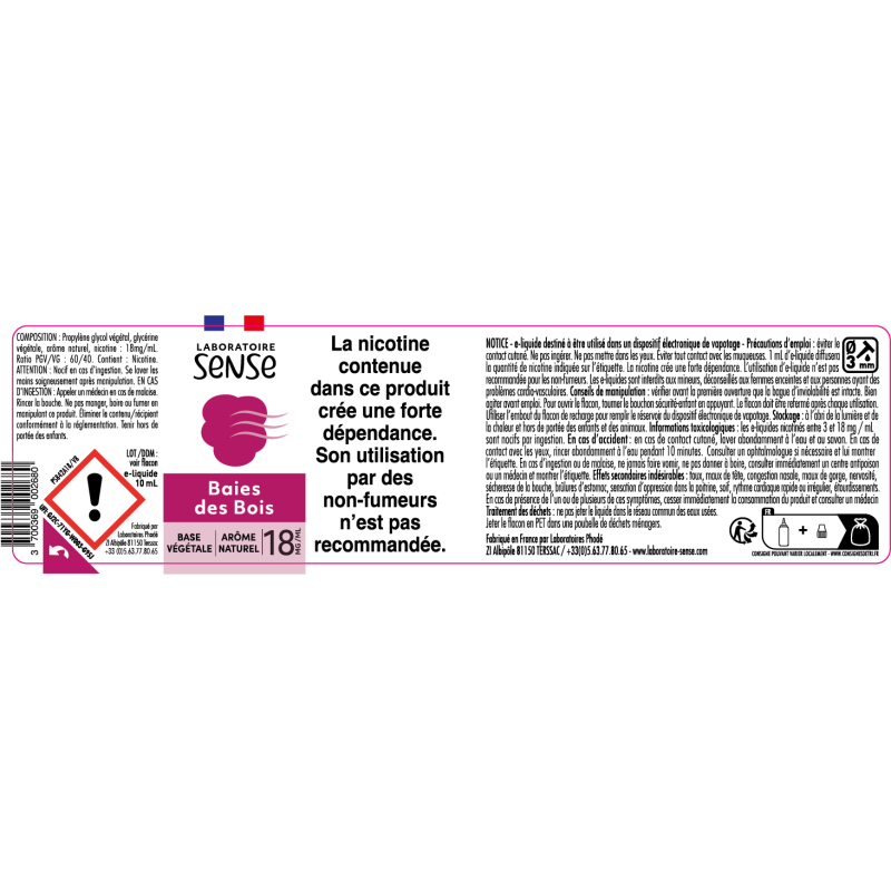 Le Laboratoire Sense a des compétences avancées en toxicologie et est un des seuls fabricants d’e- liquides qui crée ses propres arômes, assurant ainsi une sécurité optimale pour les vapoteurs. Avec 25 ans de savoir-faire aromatique et une forte spécialisation dans l’arôme naturel, nous avons d’ailleurs fait le choix de vous proposer 3 gammes exclusivement en arômes naturels (Sense/Sense Insolite/ 7 péchés capitaux).