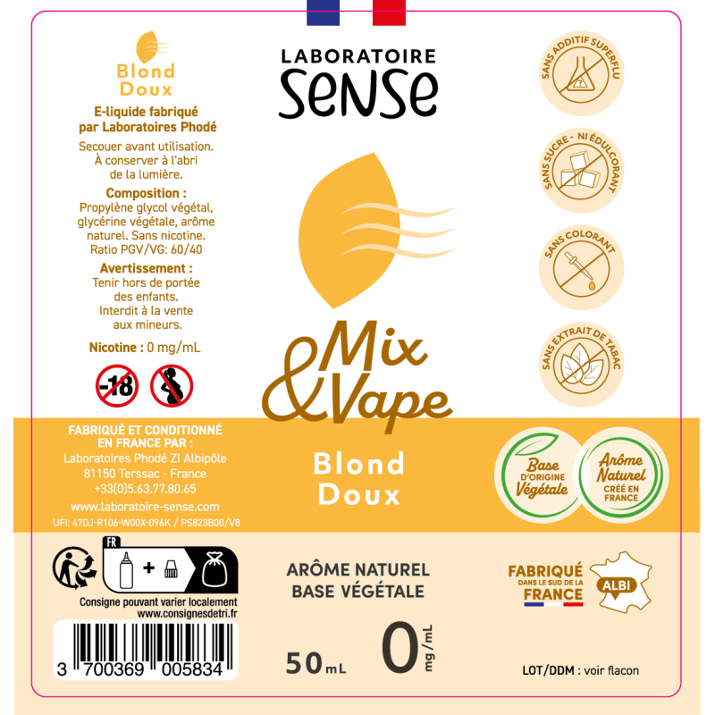 Le Laboratoire Sense sort une version Mix & Vape 60 ml de ses e-liquides vedettes. Le e-liquide T. Blond Doux Mix & Vape en 60 ml est disponible en deux taux de nicotine. Selon le taux choisi, le pack Mix & Vape contient :