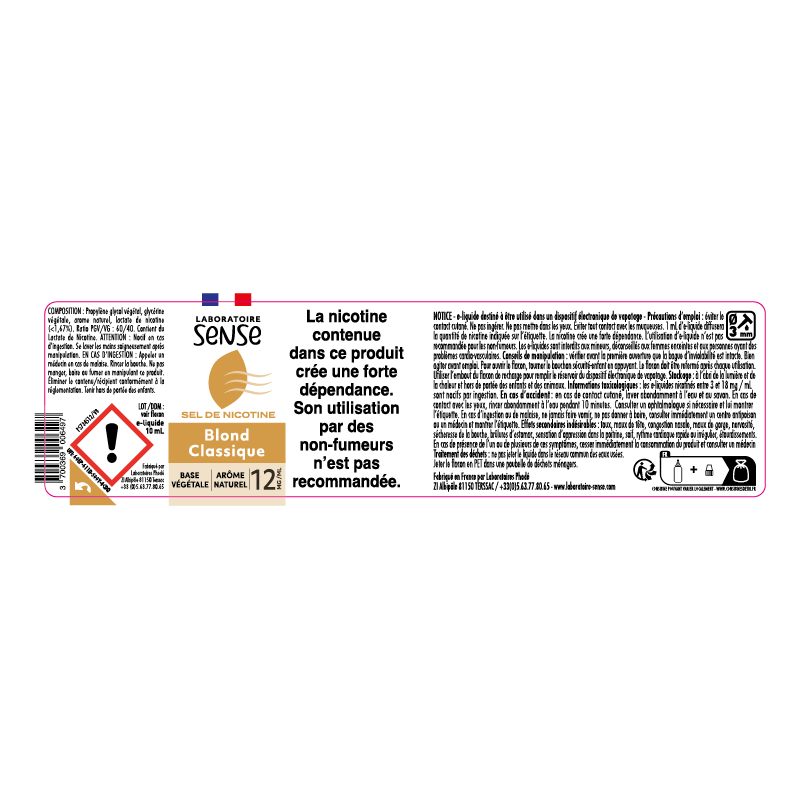 Attention : respecter les précautions d'emploi. 12 mg/mL en sel de nicotine : H302. Nocif en cas d'ingestion.