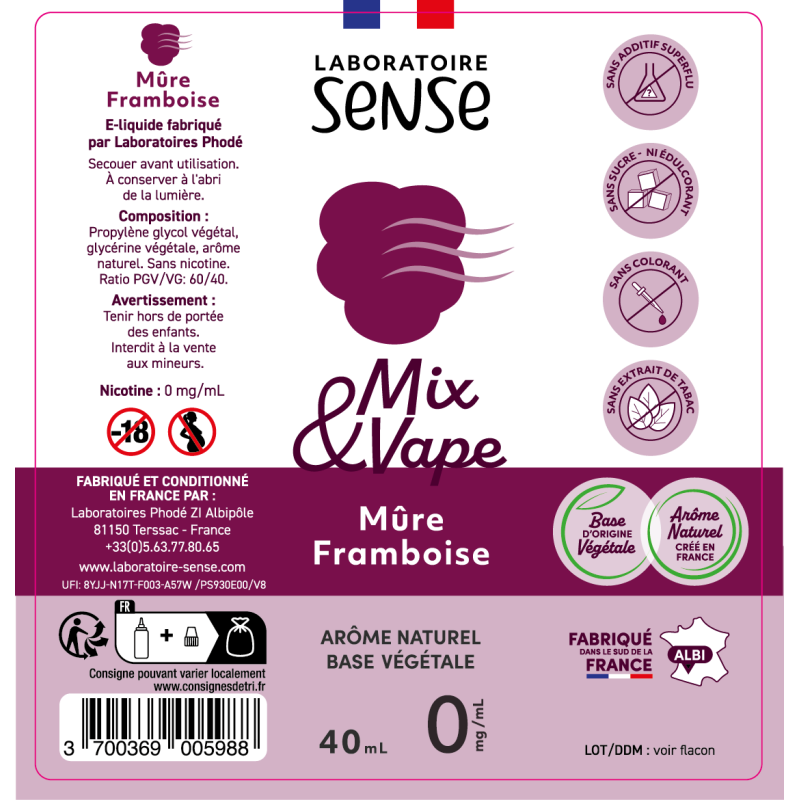 Le Laboratoire Sense sort une version Mix & Vape 60 ml de ses e-liquides vedettes. Le e-liquide Mûre Framboise Mix & Vape en 60 ml est disponible en deux taux de nicotine. Selon le taux choisi, le pack Mix & Vape contient :