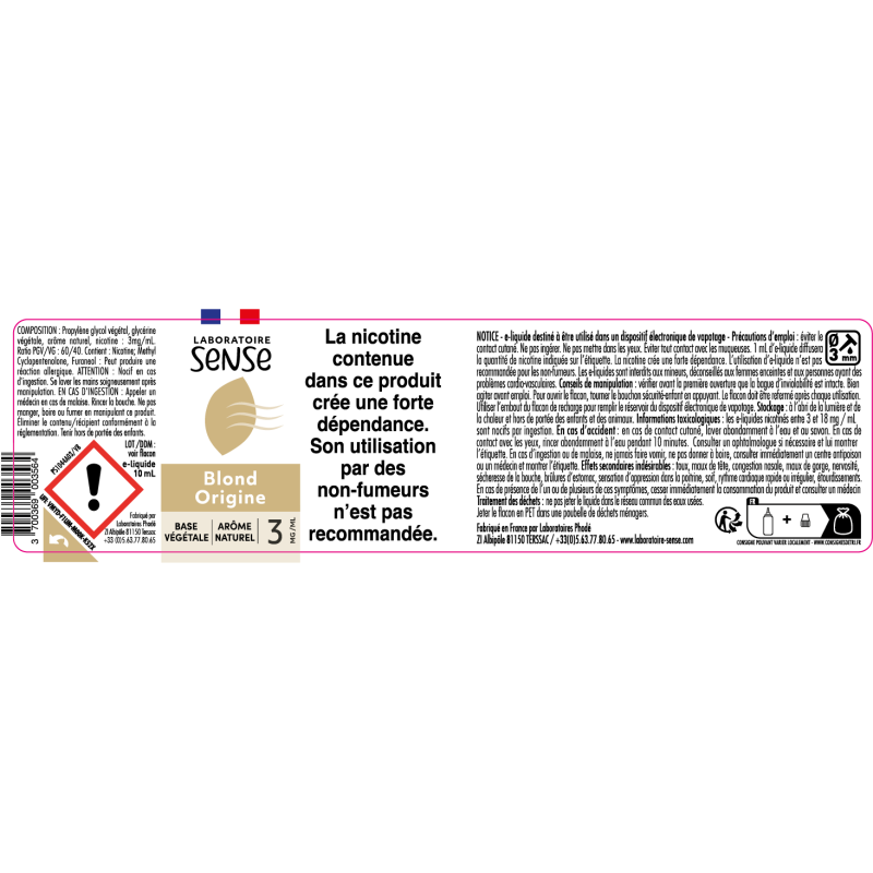 Au dos de chaque étiquette, se trouve une notice d'information à usage des consommateurs. L'Etiquetage est conforme au règlement CLP 1272/2008/CE relatif à la classification et à l’étiquetage des mélanges. Il est également conforme à la Directive européenne 2014/40/UE.