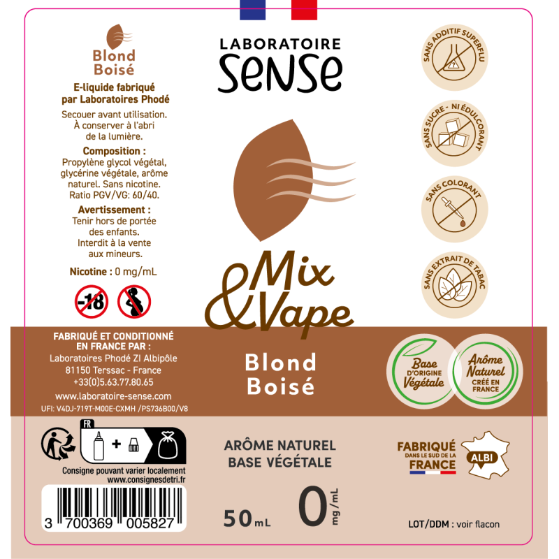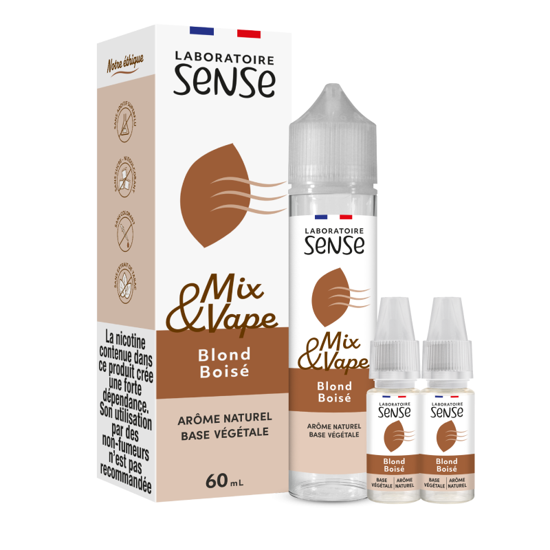 Le Laboratoire Sense sort une version Mix & Vape 60 ml de ses e-liquides vedettes. Le e-liquide T. Blond Boisé Mix & Vape en 60 ml est disponible en deux taux de nicotine. Selon le taux choisi, le pack Mix & Vape contient :