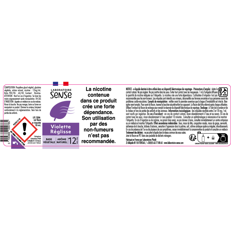 Le Laboratoire Sense a des compétences avancées en toxicologie et est un des seuls fabricants d’e- liquides qui crée ses propres arômes, assurant ainsi une sécurité optimale pour les vapoteurs. Avec 25 ans de savoir-faire aromatique et une forte spécialisation dans l’arôme naturel, nous avons d’ailleurs fait le choix de vous proposer 3 gammes exclusivement en arômes naturels (Sense/Sense Insolite/ 7 péchés capitaux).