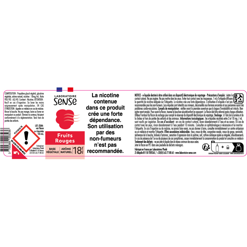 Le Laboratoire Sense a des compétences avancées en toxicologie et est un des seuls fabricants d’e- liquides qui crée ses propres arômes, assurant ainsi une sécurité optimale pour les vapoteurs. Avec 25 ans de savoir-faire aromatique et une forte spécialisation dans l’arôme naturel, nous avons d’ailleurs fait le choix de vous proposer 3 gammes exclusivement en arômes naturels (Sense/Sense Insolite/ 7 péchés capitaux).